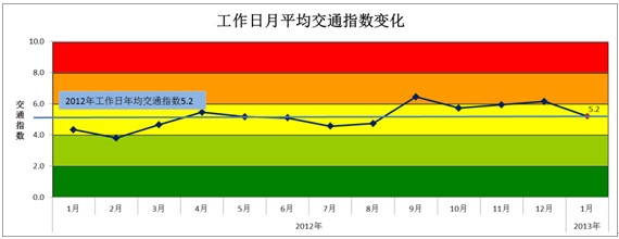 2013年1月份工作日早晚高峰平均交通指数为5.2(轻度拥堵),较2012年12月(6.1)环比下降14.8%,随冬季结束,交通拥堵好转的趋势明显。