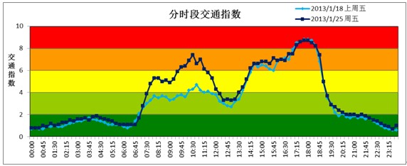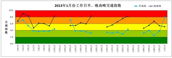 1月份早高峰平均交通指数为4.1,较2012年12月(5.0)下降18.0%;晚高峰平均交通指数6.4,较2012年12月(7.3)下降12.3%。晚高峰交通仍处于“中度拥堵”状态,且晚高峰交通指数比早高峰高出2.3。