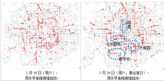 随春运正式开始,各批发市场以及火车站周边道路交通拥堵情况加剧,下图为春运首日(1月26日)和前一周周六(1月19日)早高峰(周末,早高峰时段为10:00-12:00)的拥堵路段分布图。可以对比看出北京西站周边、西直门地区、新发地周边以及木樨园批发市场周边道路频繁出现交通拥堵。