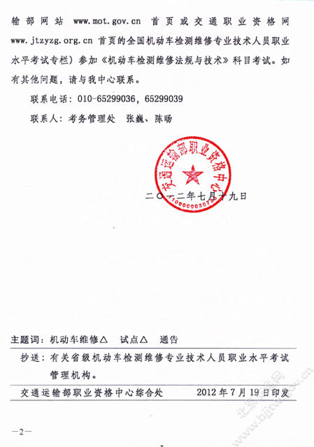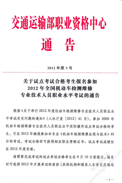 关于试点考试合格考生报名参加2012年全国机动车检测维修专业技术人员职业水平考试的通告