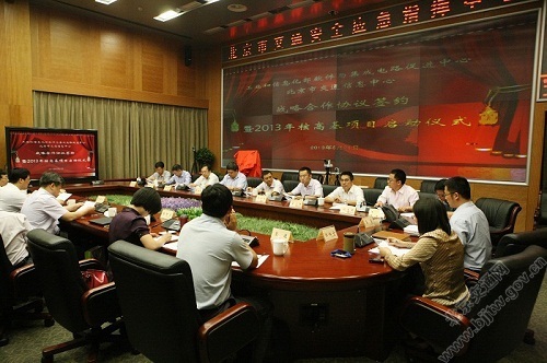5月21日,在市交通委举行了“北京市交通信息中心与工信部软件与集成电路促进中心战略合作签约暨2013年核高基项目启动仪式”活动。活动由市交通委党组副书记、副主任张树森同志主持,工信部软件司副司长郭建兵、工信部软件与集成电路促进中心副主任高松涛,核高基责任专家黄涛,核高基专项办、市经信委及委相关处室领导出席了本次活动。与会领导参观市交通运行监测调度中心(TOCC)并重点听取了核高基项目的初步成果,见证了战略合作协议的签署,共同为“国家软件公共服务平台-安全可靠交通信息化应用推广示范基地”揭牌。