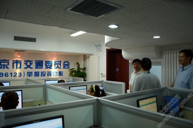 9月5日,市交通委主任刘小明带队到委举报投诉中心(96123)调研并为中心揭牌,市交通委委员逯福全、市交通执法总队副总队长岳秀军、委办公室主任庄建华、人事处处长朱筱林、宣传处处长孙文剑、安全监督与应急处副处长许书英一同调研。