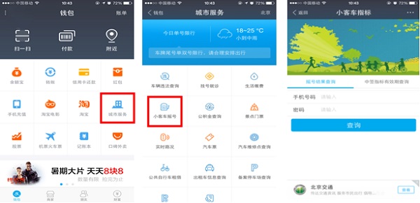 支付宝:用户登录手机支付宝首页,打开[城市服务]就可以看到北京交通委提供的十大类交通服务,以小客车指标为例,北京市民点击小客车摇号,就可以进行摇号结果的查询和中签指标有效期的查询。