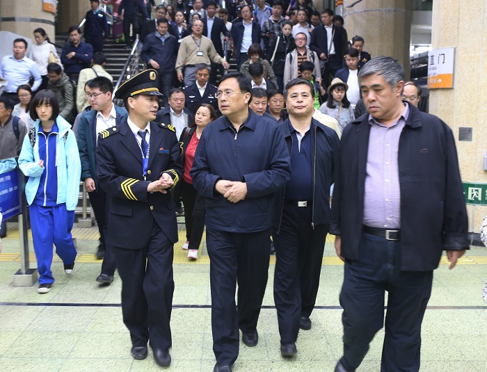 4月27日,市交通委主任周正宇带队到地铁西直门站检查“五一”期间地铁运营安全,副主任王兆荣,委员逯福全、王春强一同调研。