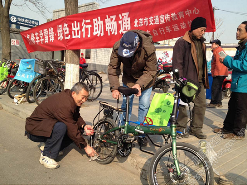 3月5日,北京市交通宣传教育中心联合北京市自行车运动协会举办“义务修车学雷锋·绿色出行助畅通”活动。200余名志愿者及交通宣讲员在丰台区右安门社区和北京市辖区主要道路等24个站点为市民义务修车、开展交通宣讲,并通过微信扫码的方式介绍“绿色出行”小常识,在践行和弘扬雷锋精神的同时,积极倡导“绿色骑行”、“低碳出行”理念。2015年,北京交通宣讲团将更多筹划、组织群众参与性活动,让“绿色出行”这一理念更加深入市民心中。
