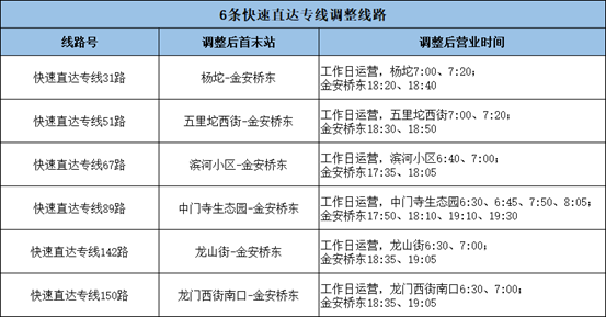 途经地铁苹果园站的6条快速直达专线,由地铁苹果园站缩短至金安桥东站上下客,调整后的运营时间见下表。