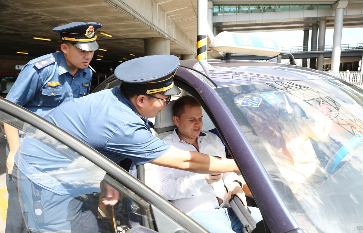 执法队员在首都机场执法检查时,帮助外国乘客与出租车司机交流。