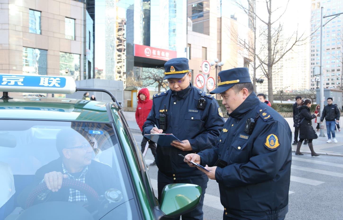 地区交通运输环境秩序良好,市交通执法总队加大出租汽车行业执法检查力度,图为执法人员在国贸地区检查出租汽车。